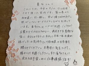 この9月に富山県からお越しのお客様がその後秋田県に引っ越しされ、秋田のお酒をお送り頂きました。 夏田冬蔵&美酒の設計、初めてお目にかかるお酒です!(^^)! 秋田では雪が降り始めたとのことでこれから長い厳しい冬の到来ですが お身体には気を付けてお過ごし頂きたいです。またいつの日かお嬢ちゃんとワンちゃんとご一緒に来て下さい。 有り難うございました。